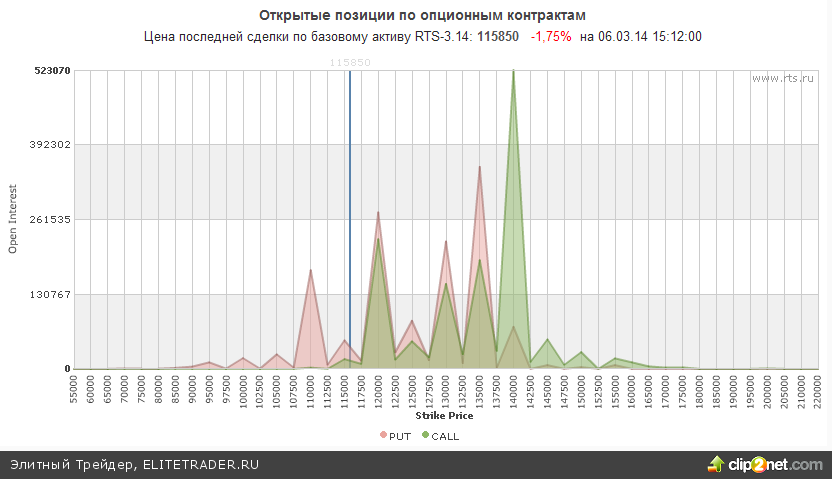 Между тем открытые опционные позиции по RIH4 со сроком исполнения 17.2.13 сейчас не дают однозначного сигнала. На отметке 110000 можно увидеть большое количество опционов пут, которые выступают сильной поддержкой, а уже в районе 120000 можно заметить большое скопление опционов колл.