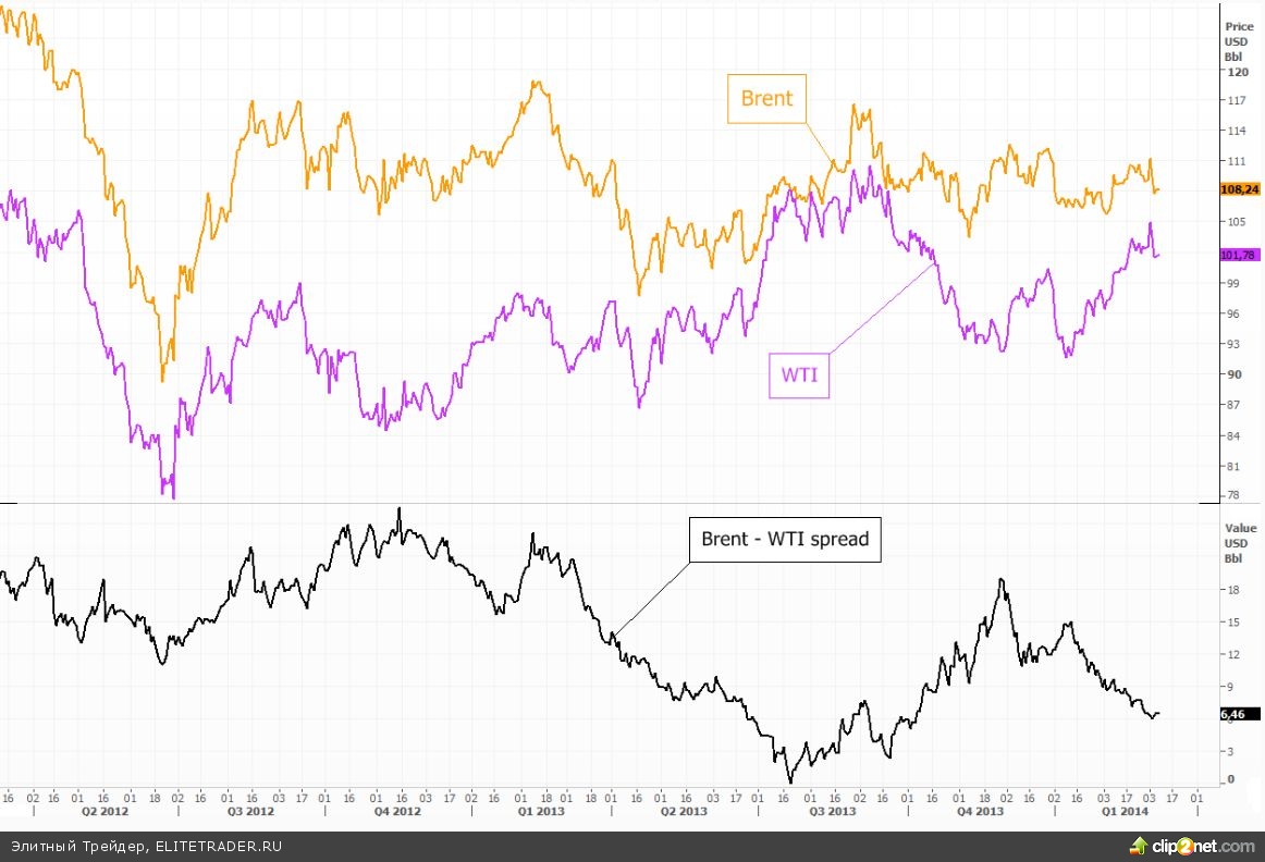 На конец недели апрельские нефтяные фьючерсы марки Brent находятся вблизи отметки в $108,2. С прошлой пятницы они упали на 0,8%, стоимость WTI понизилась до $101,8, опустившись на 0,8%. Спрэд между марками остался примерно на том же уровне и в данный момент составляет около $6,4.