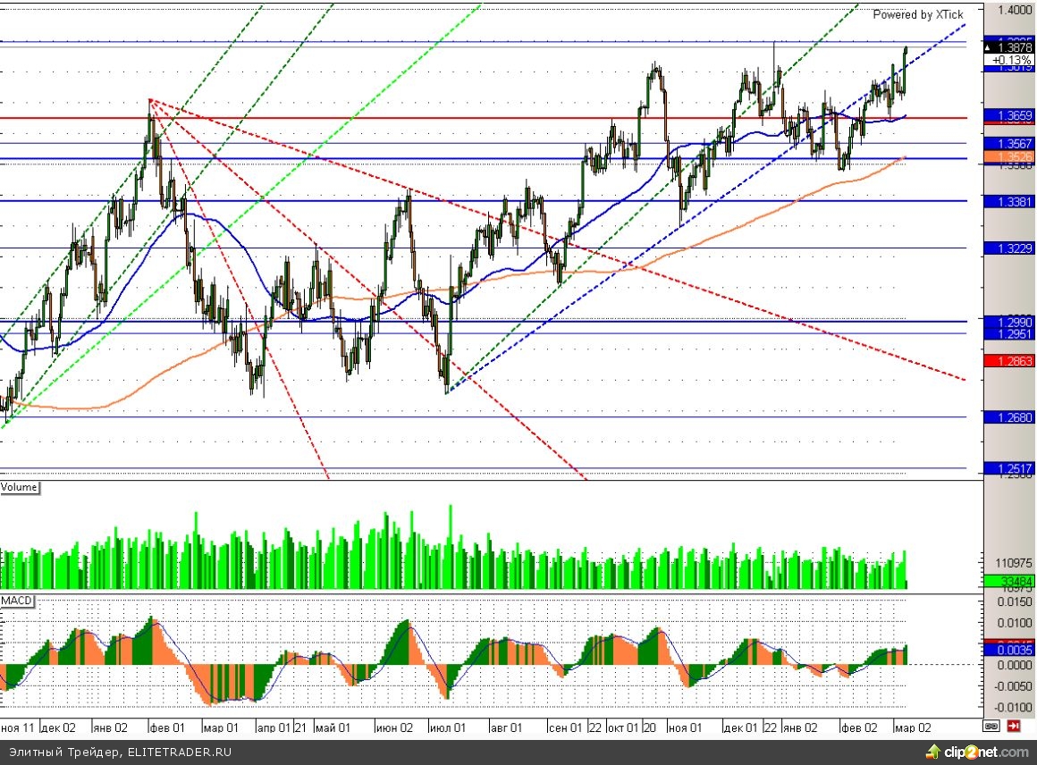 Евро растет на 0,13% по отношению к доллару. Европейская валюта накануне ушла выше ключевого сопротивления в районе 1,375 и вполне может продолжить свой рост в ближайшем будущем. Драйвером для этого, вероятно, будут итоги заседания ЕЦБ, которое происходило накануне, а также хорошие макроэкономические данные. В частности регулятор оставил вчера все ставки на прежнем уровне, дополнительное стимулирование региону не обещал, а прогноз ВВП на 2014 год поднял до роста в 1,2%. При этом деловая активность в производственном секторе еврозоны выросла в феврале до 53,2, а в сфере услуг добралась до 52,6.
