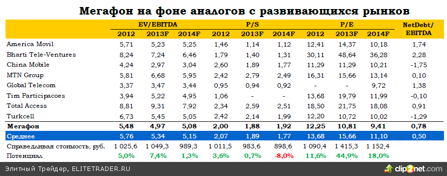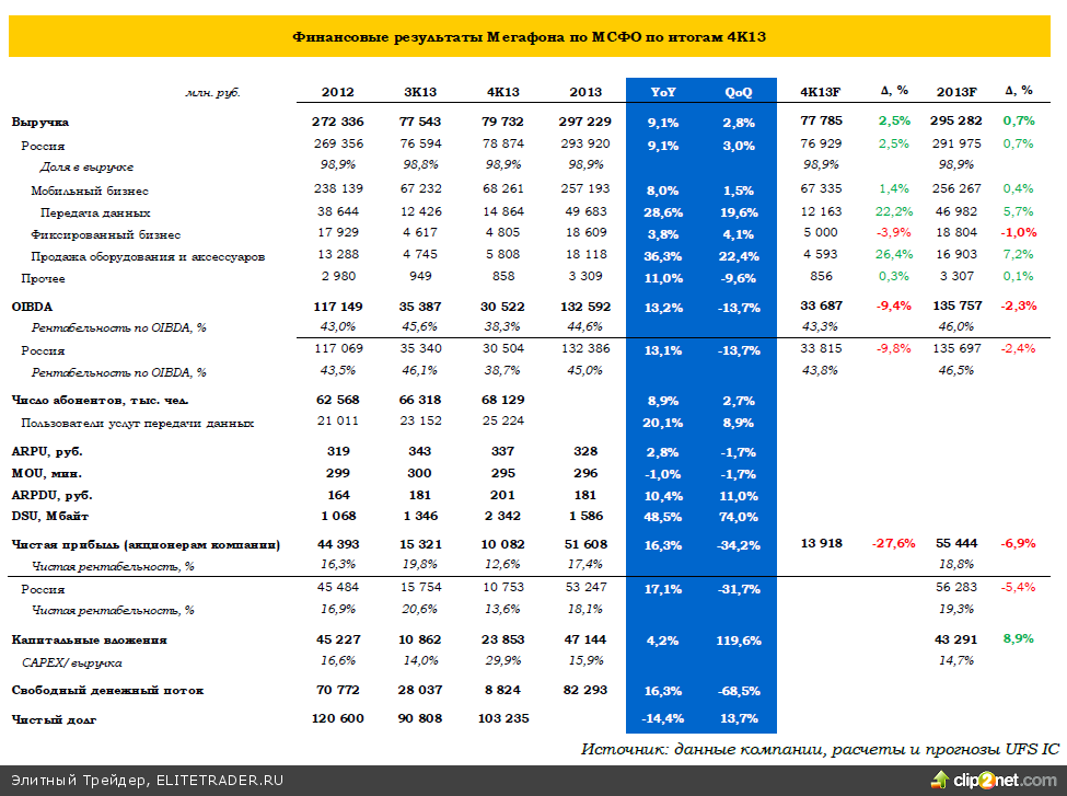 Мегафон одним первым среди операторов «большой тройки» отчитался за четвертый квартал и 2013 год. В целом, результаты мы оцениваем как сильные и ожидаем увидеть позитивную реакцию на них в котировках акций компании. Прежде всего, значительный рост по итогам года показала абонентская база оператора – на 8,9% г/г до 68,1 млн человек. Более того, существенный рост показало число пользователей мобильной передачи данных (20,1% г/г до 25,2 млн человек), что происходит за счет все большего проникновения смартфонов. Консолидированная выручка оператора в 2013 году выросла на 9,1% до 297,2 млрд рублей, даже немного превысив наш прогноз. Основными драйверами роста выручки по-прежнему остаются сегменты продажи оборудования (+36,3% г/г) и мобильной передачи данных (+28,6% г/г) – темп роста выручки в этих сегментах оказался лучше наших смелых ожиданий. Высокие темпы роста в сегменте мобильной передачи данных –результат сделки по приобретению Мегафоном «Скартел» (Yota) в октябре 2013 года. Это в частности должно способствовать экономии при строительстве и обслуживании сети. Здесь же отметим, что в начале года Мегафон заключил прямой договор с Apple на 3 года на покупку 750 тыс. iPhone, что будет также способствовать росту выручки от продаж смартфонов и будет стимулировать потребление мобильного трафика данных. Показатель OIBDA в 2013 году рос быстрее выручки – на 13,2% до 132,6 млрд рублей, в итоге рентабельность по OIBDA достигла 44,6% (43,0% в конце 2012 года). Если же рассмотреть квартальный показатель OIBDA – то он, напротив, сократился относительно 3К13, что было связано с увеличением операционных расходов. Также в четвертом квартале оператор увеличил затраты на приобретение телефонов и оборудования почти на 50%, что однако было оправдано ростом продаж в сегменте на 22,4%. Чистая прибыль в 2013 году увеличилась на 16,3% до 51,6 млрд рублей, причем чистая рентабельность также показал рост относительно уровня 2012 года: с16,3% до 17,4%. Отдельно отметим, что по итогам величина CAPEX оператора составила лишь 15,9% от выручки (16,6% по итогам 2012 года), что являлось целевым уровнем компании. Общая величина капитальных затрат составила 47,1 млрд рублей, что оказалось даже ниже прогнозного значения руководства: 50-55 млрд рублей. Снижение CAPEX положительно сказалось на величине свободного денежного потока компании: рост показателя в 2013 году составил 16,3% (до 82,3 млрд рублей). Такой результат может быть позитивно воспринят инвесторами, учитывая, что Мегафон осуществляет дивидендные выплаты, исходя из величины 70% от FCF или 50% от чистой прибыли, уменьшенной на величину чистого долга. Чистый долг к концу 2013 года также сократился на 14,4% г/г до 103,2 млрд рублей (что, впрочем, оказалось на 13,7% выше уровня 3К13). Опубликованные результаты мы оцениваем как сильные: они смотрятся значительно лучше отчитавшегося на днях Вымпелкома. В первом квартале 2014 года существенную поддержку результатам компании окажет проведение Олимпийских игр в Сочи. На 2014 год мы сохраняем позитивный взгляд и ожидаем, что основными источниками роста выручки останутся сегменты передачи данных и продажи оборудования. Добавим, что ожидания от появления в отрасли четвертого крупного игрока – СП Ростелекома и Tele2 – переносятся на конец 2014 – 2015 год, что позволит Мегафону демонстрировать высокие темпы роста еще как минимум год. Сохраняем оценку справедливой стоимости акций