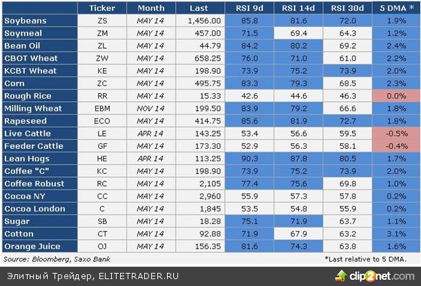 Вместе с ценами на сельскохозяйственном рынке увеличились признаки перекупленности. Индекс относительной силы (RSI) — это технический индикатор, который помогает определить состояние перекупленности или перепроданности рынка. Когда индекс превышает уровень 70, то рынок считается перекупленным, когда значение равно менее 30 — перепроданным, однако часто у трейдеров есть собственные предпочтения, в соответствии с которыми они выставляют параметры. По умолчанию временным интервалом по индексу RSI для большинства трейдеров является период в 14 дней. Как видно в приведенной ниже таблице, большая часть наиболее активно торгуемых сельскохозяйственных товаров сейчас находится в зоне перекупленности, и это может помешать им в ближайшей перспективе продолжить рост.