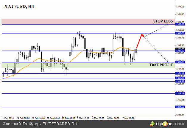 Экономический календарь текущей недели назвать насыщенным нельзя. Тем не менее, несколько интересных отчетов к публикации запланировано. В четверг, 13 марта, внимание стоит обратить на данные по промышленному производству Китая. Тогда же, только уже на американской сессии, выйдет отчет по розничным продажам в США. В преддверии заседания Комитета по открытым рынкам ФРС США, отчет будет очень интересен, поскольку именно состояние экономики страны может позволить регулятору изменить темпы выхода из программы количественного стимулирования. В пятницу внимание на данные по потребительскому доверию от Университета Мичигана. Умеренно позитивная макроэкономическая статистика из-за океана может спровоцировать возврат котировок золота к уровню поддержки 1330,05.
