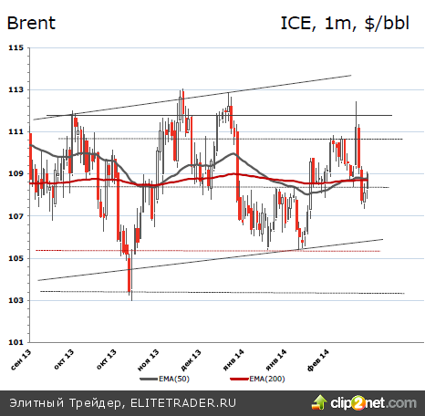 Котировки Brent пробили поддержку и опустились ниже оказывает давление на котировки $109, и теперь уровень $108.7-109 выступает в роли сопротивления, подкрепляемый 20-дневной ЕМА. В ближайшие дни ожидаем тестирования этого сопротивления и в случае успеха - консолидации в районе $109.5. В случае же неудачи котировки останутся в пределах $107-108.5.