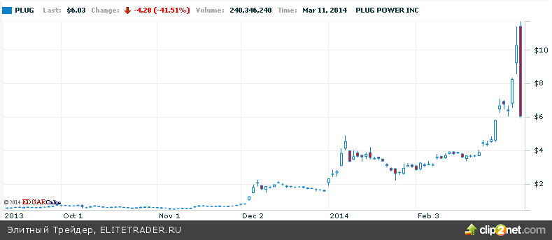 Так, акции Plug Power - разработчика и производителя оборудования для водородной энергетики, точнее сказать водородных топливных элементов вчера подешевели на 41,5%. То есть компания потеряла едва ли не половину своей стоимости после публикации отчета аналитической компании Citron Research, сделавшей вывод, что это просто напросто пузырь, и акции компании должны стоить 50 центов вместо $11. Здесь стоит отметить, что еще вчера на открытии чуть больше чем за три месяца рост цен на акции компании составлял фантастические 13500% или более уместно будет сказать о росте в 14 раз. Вслед за этим последовали распродажи и в акциях других производителей топливных элементов: Fuel Cell Energy (-16,5%), Ballard Power (-25,6%).
