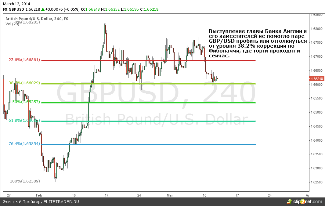 Также аналитики Romanov Сapital во вчерашних обзорах обращали внимание на заседание парламента Великобритании по вопросам инфляции. Выступал управляющий банка Англии Марк Карни и его заместители. Они высказались за необходимость большего количества сигналов о состоянии экономики. Также они сообщили о новом целевом уровне по безработице 6.3% при достижении которого стоит ожидать начала повышения процентной ставки и сокращения программы по выкупу долговых обязательств QE. Напоминаем, что согласно подсчетам, представленным в феврале, объем безработных составляет 7.2%. Поэтому они подтвердили ранее представленные прогнозы о сохранении процентной ставки в долгосрочной перспективе на текущем рекордно низком значении 0.5%. Британский фунт в паре с долларом США продолжает торги в границах горизонтального канала между 1.6600 (38.2% уровень коррекции по Фибоначчи) – 1.6750.