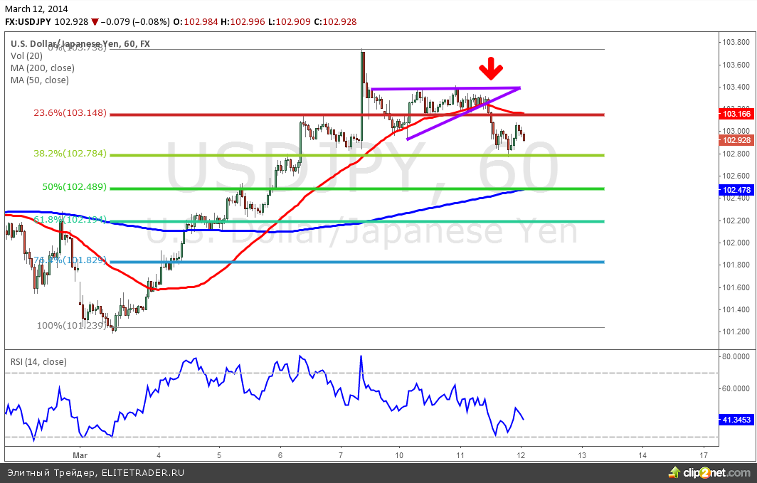 На вчерашний день было перенесено, намеченное на сегодня выступление главы Банка Японии Харухико Куроды. В своей речи он подтвердил приверженность текущей денежно-кредитной политике и отсутствие риска дальнейшему курсу со стороны экономики. Оценивая текущий уровень инфляции он сказал об “устойчивом движении” к целевому уровню в 2%. Валютная пара USD/JPY снизилась до уровня 103 после выхода из ранее обозначенной консолидации. Сопротивлением выступает уровень 103.10 (50 часовая скользящая средняя и 23.6% коррекция по уровням Фибоначчи), а поддержка 102.70 (38.2% линия Фибоначчи).