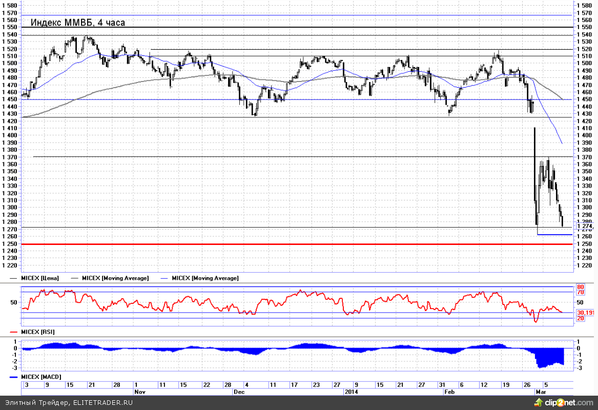 Что касается ситуации конкретно с индексом ММВБ, то вчера котировки вновь начали приближаться к ключевым уровням поддержки. Минимум года, который был установлен в прошлый понедельник, находится в районе 1265-1260. Чуть ниже на 1250 лежит ключевая горизонтальная точка опоры последних лет. Скорее всего, в ближайшей перспективе мы попробуем протестировать эти рубежи. Однако с учетом сложившейся на рынке перепроданности, первая попытка пробить ключевые отметки может оказаться ложной и затем начнет формироваться отскок наверх. Таким образом, точечные покупки будут вполне оправданны, ведь риск можно ограничить недалекой стоп-заявкой (на 1230-1235 в пересчете на индекс ММВБ). В пользу непродолжительного отскока при обновлении минимумов будут говорить и формирующиеся классические бычьи дивергенции на индикаторах 4-часовых и часовых таймфреймов. Однако сразу же отмечу, что в текущей ситуации покупкам мешает тот факт, что инвесторы опасаются ближайших выходных, ведь в воскресенье пройдет референдум в Крыму. Открывать лонг с существующей неопределенностью и рисками не каждый осмелится. Мало кто обучен «экономике военного времени», так что в таком случае многим крупным инвесторам проще избежать привлекательной дешевизны, нежели нарваться на черный понедельник. И именно это является главной причиной того, что два дня подряд рынок теряет по 2%.