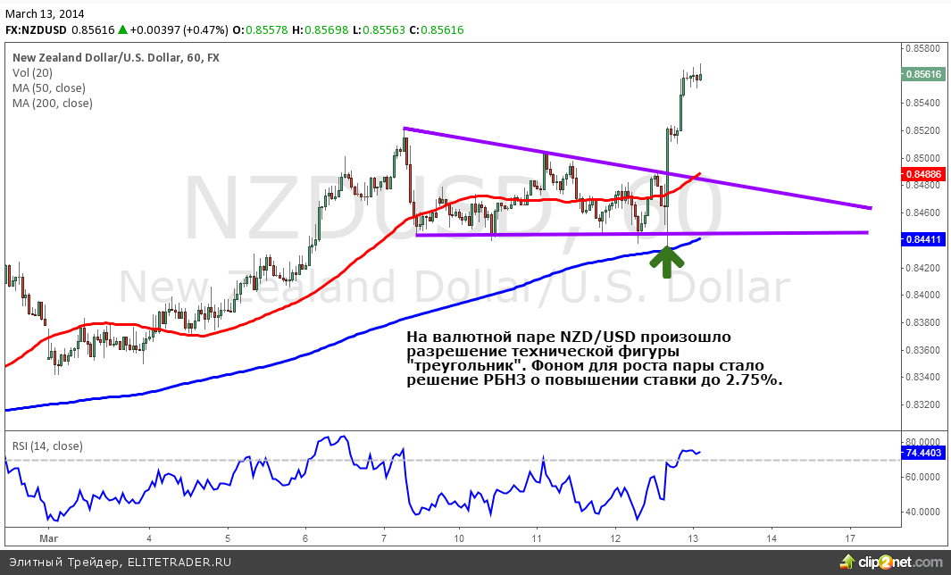 Главным ньюсмейкером ночной сессии стал Резервный банк Новой Зеландии, который повысил ставку рефинансирования до 2,75% с рекордно низкого уровня 2,50%. Решение было вполне ожидаемым, равно как и реакция рынка: пара NZD/USD демонстрирует уверенное ралли и уже преодолела 10-месячный максимум. Важно то, что регулятор просигнализировал о вероятности дальнейшего повышения ставки в общей сложности на 100 базисных пунктов в течение этого года. Соответственно, нельзя исключать тестирования максимума апреля 2013 года в районе 0.8670. Стоит также отметить привлекательный торговый сетап в паре NZD/CHF. С конца января развивается консолидация, принимающая вид Треугольника. Пробой уровня 0.7527 будет являться подтверждением выхода цены наверх и, соответственно, сгенерирует сигнал на покупку.