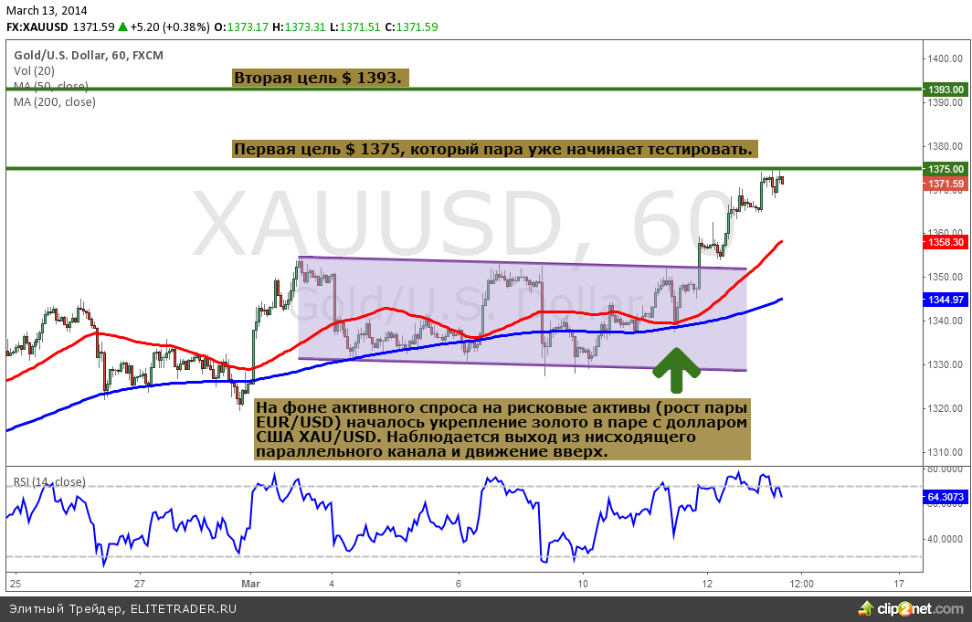 Взглянем на текущую ситуацию на паре золото за доллар США (XAU/USD). Выход из ранее обозначенного аналитиками Romanov Capital равноудаленного канала привел к увеличению котировок золота до $ 1375.