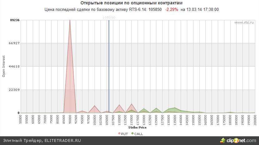 Между тем открытые опционные позиции по RIH4 со сроком исполнения 15.4.14 сейчас также смотрят преимущественно на покупку. На отметке 90000 можно увидеть огромное количество опционов пут, которые выступают как очень сильная поддержка. При этом эквивалентного количества опционов колл сейчас попросту нет.