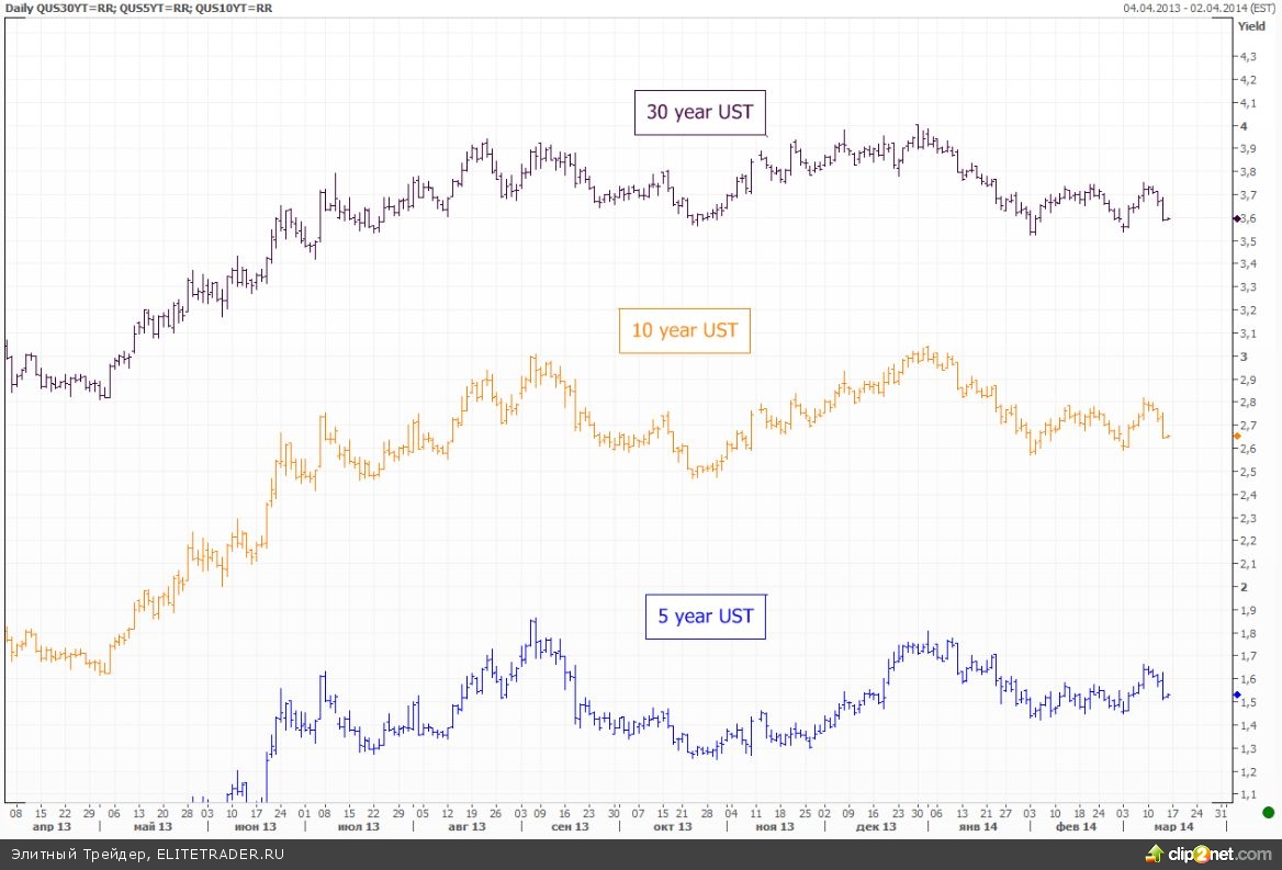 Между тем, у инвесторов были и другие весомые причины для продаж на столь высоких уровнях. Слабые данные по розничным продажам и промпроизводству в Китае и напряженная ситуация на Украине провоцировали уход в безрисковые активы, что мы и наблюдали. Доходность казначейских облигаций вчера сделала существенный рывок вниз.