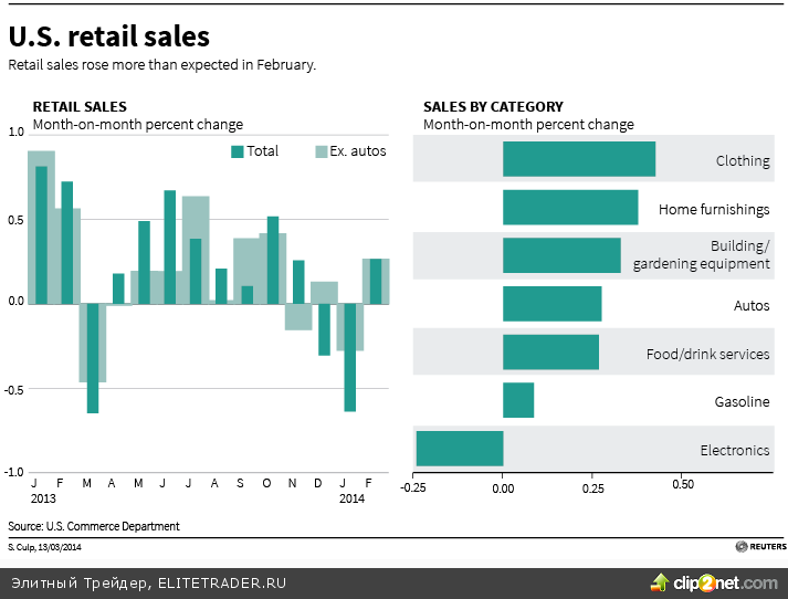 Отчет по розничным продажам указал на рост показателя в феврале на 0,3% до $427,2 миллиарда, против прогнозных 0,2%. Однако предыдущее значение было пересмотрено с -0,4% до -0,6%. С одной стороны конечно позитивно, что ситуация улучшилась в сравнении с январем, с другой в абсолютном выражении цифры февраля оказались меньше первой оценки января, не говоря о том, что аналитики ожидали порядка $428,66 млрд.