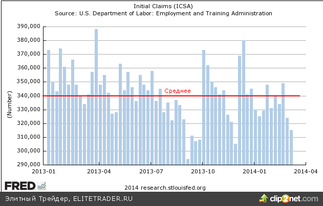 Число первичных обращений за пособиями по безработице сократилось за неделю с пересмотренных 324 до 315 тыс., тогда как аналитики ожидали роста до 330 тыс. Показатель довольно далеко отступил от годового среднего, что, говоря сугубо о сухих цифрах, дает оптимистичный взгляд на рынок труда.