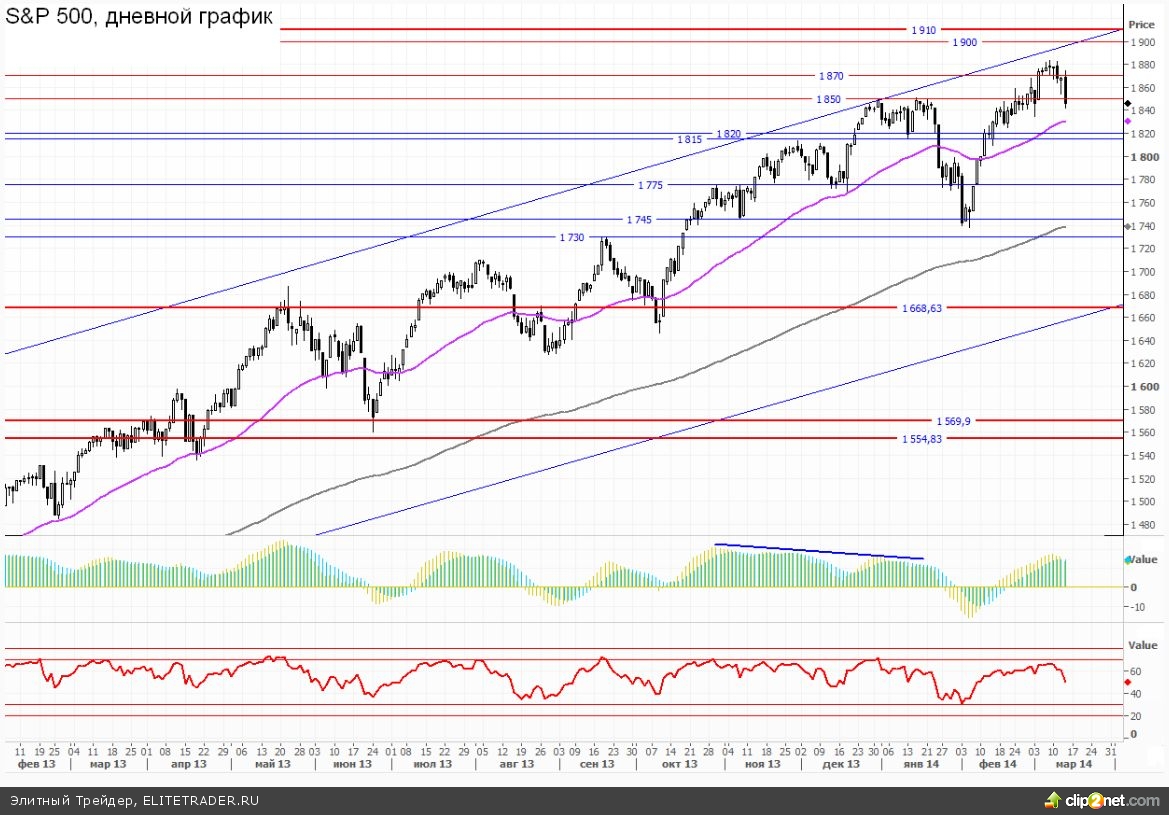 Вечно растущий американский рынок акций вчера снова попытался развернуться. Индекс широкого рынка SnP 500 опустился ниже первой реперной точки (1850), пробой которой сигнализирует о высокой вероятности разворота тенденции. Об обновлении февральских минимумов и ускорении снижения можно будет еще более уверенно говорить по факту спуска индекса ниже 1820.