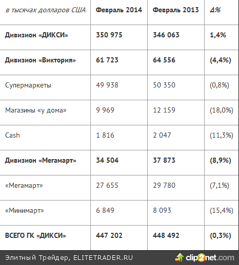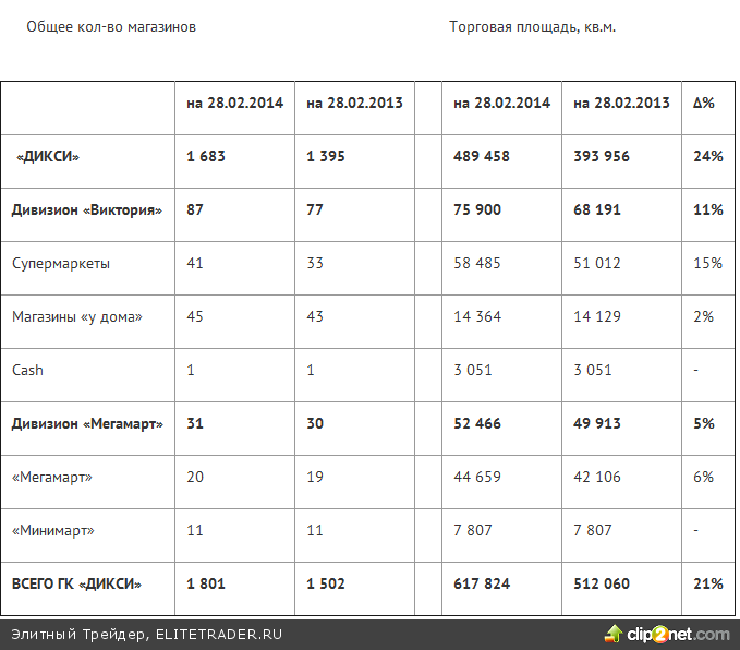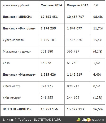 В феврале текущего года «ДИКСИ» показала хорошие результаты. Выручка увеличилась на 16,5% по сравнению по сравнению с февралем 2013 года и составила 15 753 136 тыс. руб. При этом в долларовом выражении выручка в отчетном периоде снизилась на 0,3% - до 447 202 тыс. долл. Наибольший рост выручки в феврале 2014 года показали магазины формата «ДИКСИ» - 18,4% до 12 363 451 тыс. руб. Выручка магазинов формата Виктория в феврале 2014 года увеличилась на 11,7% и составила 2 174 259 тыс. руб. Общее количество магазинов на 28.02.2014, по сравнению с 28.02.2013 увеличилось до 1 801. Торговая площадь на 28.02.2014, по сравнению с 28.02.2013 увеличилось на 21% - до 617 824 кв. м.