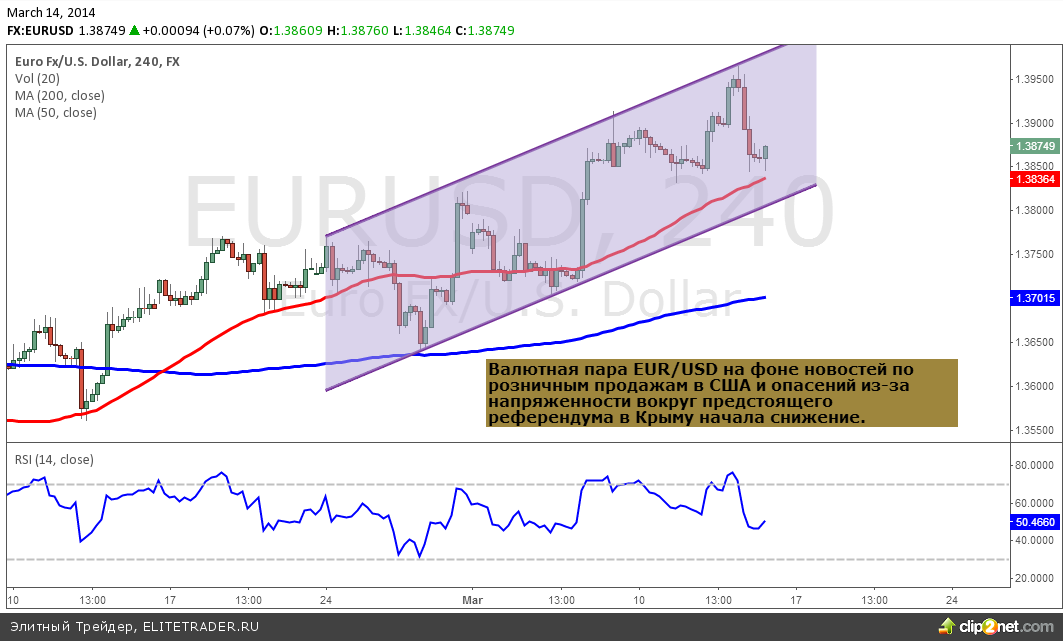 Валютная пара доллар США к российскому рублю продолжает торговаться в восходящем канале на опасном новостном фоне из-за ситуации в Крыму и ослабления валют развивающихся стран после решения ФРС США по началу сворачивания программы количественного смягчения QE 3. На момент написания новости за 1 доллар США на валютном рынке готовы были предложить 35.66 рублей.