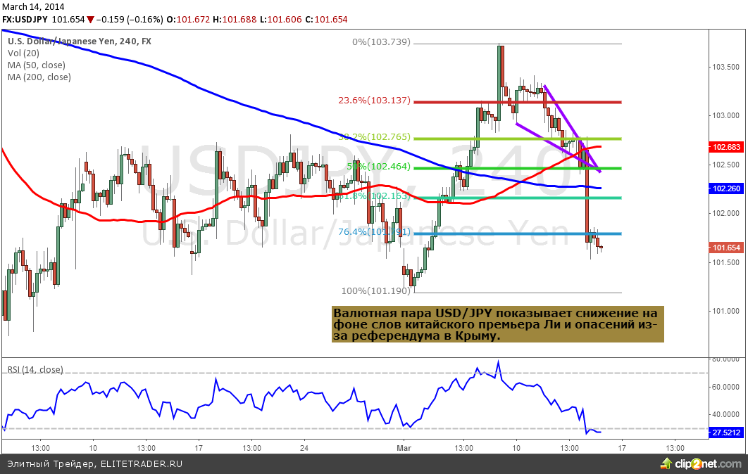 Но вчерашняя торговая сессия и старт сегодняшней на фондовых площадках и на валютном рынке проходит во власти “медведей” на фоне паники из-за предстоящего референдума в Крыму и заявлений премьер-министра Китая Ли. Руководитель китайского правительства снизил целевое значение по ВВП на 2014 год до 7.5%. Ухудшению оценок темпов роста ведущей экономики азиатско-тихоокеанского региона привело к спросу на надежные активы. Также на фоне опасений инвесторов из-за осложнения ситуации в Крыму, ввиду назначенного на 16 марта референдума о статусе и угроз применения санкций в отношении России со стороны стран Европейского Союза и США, продолжился активный спрос на японскую йену, наблюдавшийся в течении этой недели. Валютная пара USD/JPY снизилась к значению 101.70, хотя торги в начале недели проходили выше отметки 103 йены за доллар США.