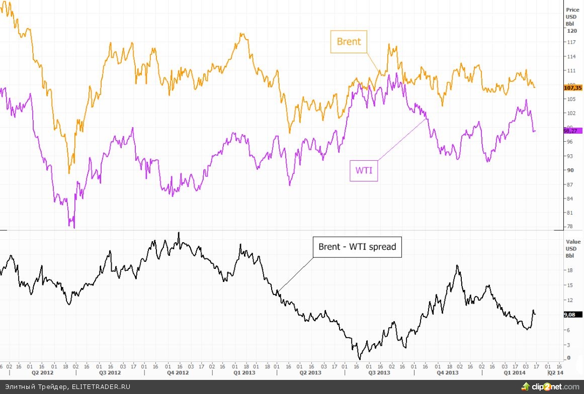На конец недели апрельские нефтяные фьючерсы марки Brent находятся вблизи отметки в $107,4. С прошлой пятницы они упали на 0,6%, стоимость WTI понизилась до $98,3, опустившись на 2,8%. Спрэд между марками вырос и в данный момент составляет около $9,1. Отчасти рост разницы был обусловлен новостью о том, что Министерство энергетики США объявило о планах продать в профилактических целях до 5 млн баррелей сырой нефти из стратегических запасов нефти. Это происходит впервые с 1990 года. По официальным данным SPR, по состоянию на 21 декабря 2012 г. объем нефти в стратегических резервах составлял 694,9 млн баррелей. Пресс-секретарь министерства энергетики Билл Гиббонс заявил, что продажа нефти из стратегических нефтяных резервов является тестовой, однако многие эксперты связали эти действия с ситуацией в Украине - своеобразный намек В. Путину.