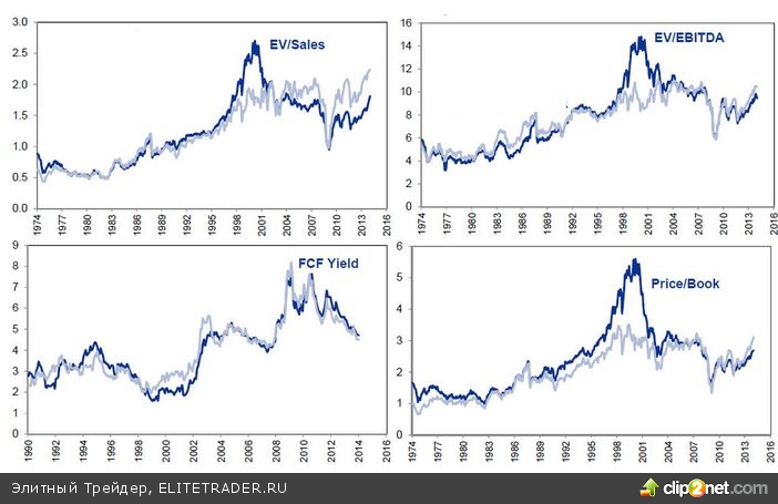 Соотношения капитализации и выручки (EV/Sales), а также рыночной стоимости и прибыли компаний, входящих в базу расчета SnP500 (EV/EBITDA), находятся ниже исторической средней, отображенной на графиках менее насыщенным синим цветом. Их пики также были отмечены в 1999 году. Что касается величины свободного денежного потока на одну акцию (FCF Yield), то по правилам анализа чем ниже данный коэффициент, тем менее привлекательны инвестиции, поэтому у покупателей американских бумаг все еще есть простор для маневра.