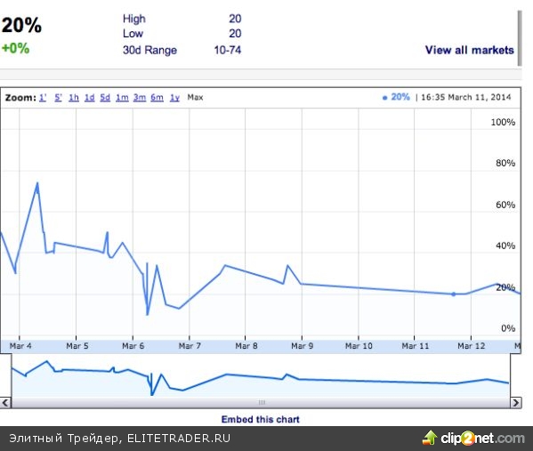 К 15 часам 6 марта вероятность экспроприации оценивалась в ничтожные 2% (способствовала более-менее нейтральная речь госсекретаря США Керри), однако уже к 19:19 контракт стоит $45. Причина – Госдума назначила на 10 марта рассмотрение закона о присоединении Крыма, что в очередной раз повысило вероятность обоюдных санкций. Также в 17:10 на лентах информагентств появилась новость, что США ввели визовые ограничения против ряда чиновников и физлиц, что опять-таки повысило вероятность ответных мер.