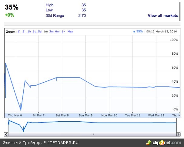 После этого за один час, к 23:22 московского времени вероятность упала до 20%, а затем всего лишь за минуту – к 23:23 – контракт подорожал до $70. Что произошло в эту минуту? По лентам информационных агентств, в том числе и зарубежных, установить точную причину не удалось. Примерно за полчаса НАТО заявило о пересмотре отношений с Россией, а еще чуть раньше Хиллари Клинтон сравнила (правда, чуть позже открестилась от своих слов) действия Москвы с нацисткой агрессией. В общем, для пугливых инвесторов достаточно.