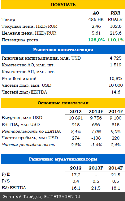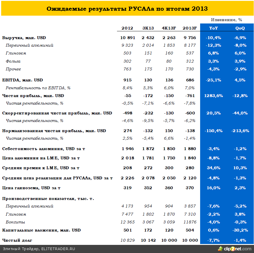 На следующей неделе РУСАЛ опубликует финансовые результаты по МСФО за 2013 год. На фоне сокращения выпуска и относительно невысоких цен на алюминий на мировом рынке, в натуральном выражении результаты вряд ли смогут впечатлить инвесторов. При этом, однако, мы отмечаем качественные изменения в компании. РУСАЛ следует озвученному плану сокращения производства, и, несмотря на значительную социальную нагрузку, компании удалось существенно сократить выпуск на нерентабельных предприятиях. При этом другие крупные производители алюминия последовали тем же путем, в результате мировой рынок алюминия впервые с кризиса 2008 года стал дефицитным, при этом дефицит составил 570 тыс. тонн. Сохраняется угроза со стороны LME, где изменение складских правил приведет к реализации накопленных запасов, однако это разовое событие, в отличие от процесса сокращения выпуска. Оптимизация производства позволит компании наращивать рентабельность, что будет заметно уже по итогам года, но в большей степени скажется в 2014 году. Мы позитивно оцениваем ход переговоров компании с кредиторами по рефинансированию долгов. По итогам года ожидаем от РУСАЛа внушительного свободного денежного потока (в основном за счет Норникеля). Ожидаем выручку по итогам 4К13 на уровне $2 263 млн, EBITDA в размере $136 млн и нормализованную чистую прибыль в районе $150 млн. Сохраняем умеренно-позитивный взгляд на рынок алюминия и на перспективы компании в 2014 году. Мы пока подтверждаем оценку справедливой стоимости компании на уровне 215,6 рублей за РДР, хотя в текущих условиях она и выглядит несколько оптимистичной.