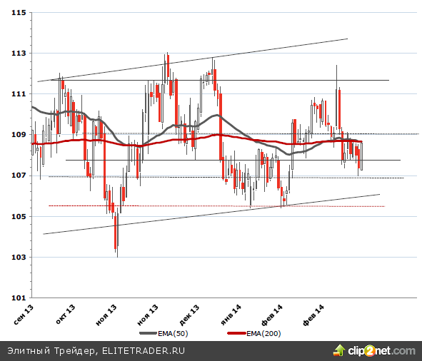Котировки Brent никак не могут преодолеть сопротивление влияние данного фактора постепенно сходит на нет $108.6, в районе которого 20-дневная ЕМА вплотную приблизилась к 50-дневной и готова ее пробить сверху вниз, что будет указывать на вероятность коррекции. Если сопротивление не удастся преодолеть, цены продолжат колебаться в промежутке $107-109.