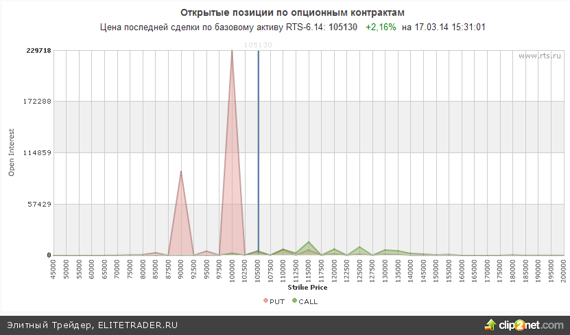 Между тем открытые опционные позиции по RIM4 со сроком исполнения 15.3.14 сейчас также смотрят на покупку. На отметке 100000 можно увидеть огромное количество опционов пут, которые выступают как очень сильная поддержка. При этом эквивалентного количества открытых опционов колл сейчас просто нет.