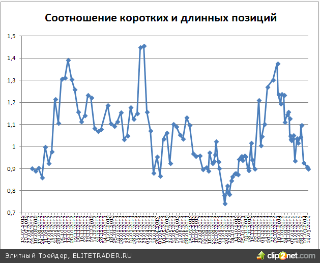 Обратив внимание на открытые юридическими лицами позиции по фьючерсу на индекс, можно заметить, что настроения крупных игроков за последние несколько существенно не изменились и продолжают смотреть в сторону роста. Соотношение коротких и длинных позиций по состоянию на 14 марта составляет 0,898 против 0,908 двумя днями ранее.
