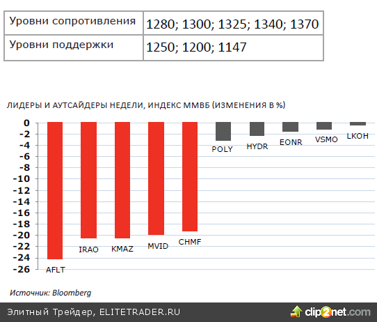 Индекс ММВБ в течение четырехдневной недели был под давлением. В пятницу была пробита линия минимумов 2012 – 2013 гг. на уровне 1250 пунктов, в моменте индекс уходил и ниже минимума 2010 года (1200 пунктов). Во второй половине пятничной сессии выраженный отскок вверх позволил часть потерь отыграть, тем не менее недельные потери превышают 7%