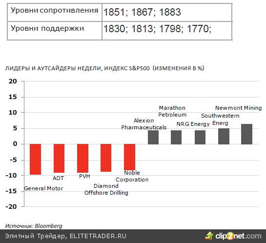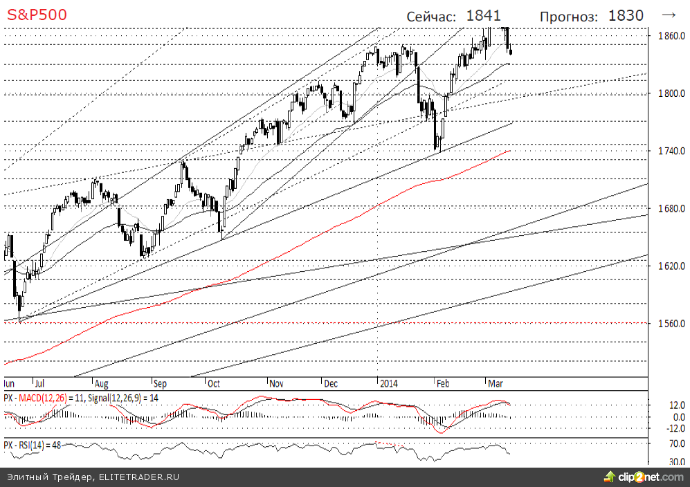 На этой неделе ожидаем продолжения снижения индекса. Ближайшая поддержка в районе 1830 пунктов, выше этой отметки рост серьезно замедлился месяц назад, и здесь же проходит 50-дневная EMA. В перспективе нескольких недель целью может оказаться линия восходящего тренда второй половины 2013 (около 1770 пунктов)