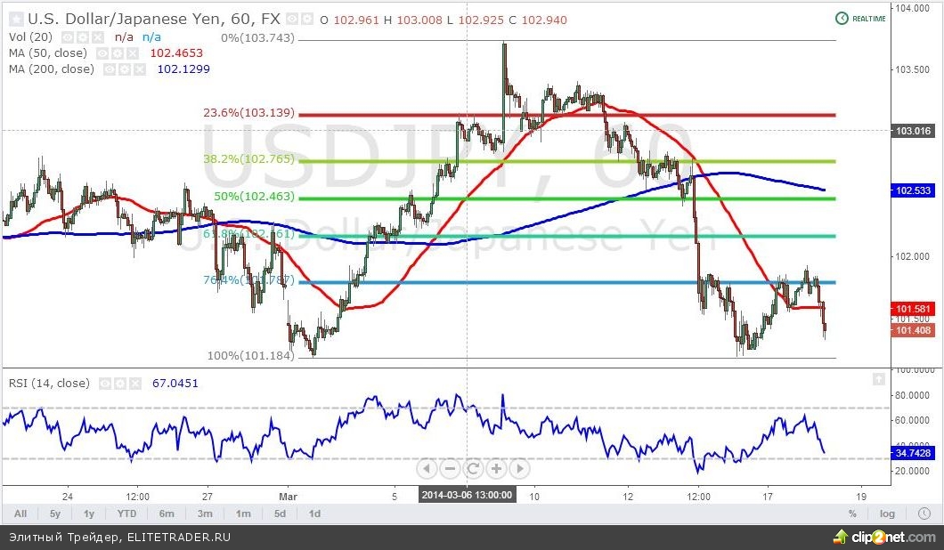 В выходные внешним фоном, сопровождающим торги, стал референдум в Крыму. 96.77% голосовавших высказались за присоединение полуострова к Российской Федерации , на что конечно же негативно отреагировали официальные представители новой власти в Киеве, странах ЕС и США. Напряженный политический фон способствовал повышению интереса инвесторов к безрисковым активам, в частности к японской йене. Валютная пара USD/JPY продолжила развивать тренд на снижение и достигла отметки 101.20, после чего стала укрепляться.