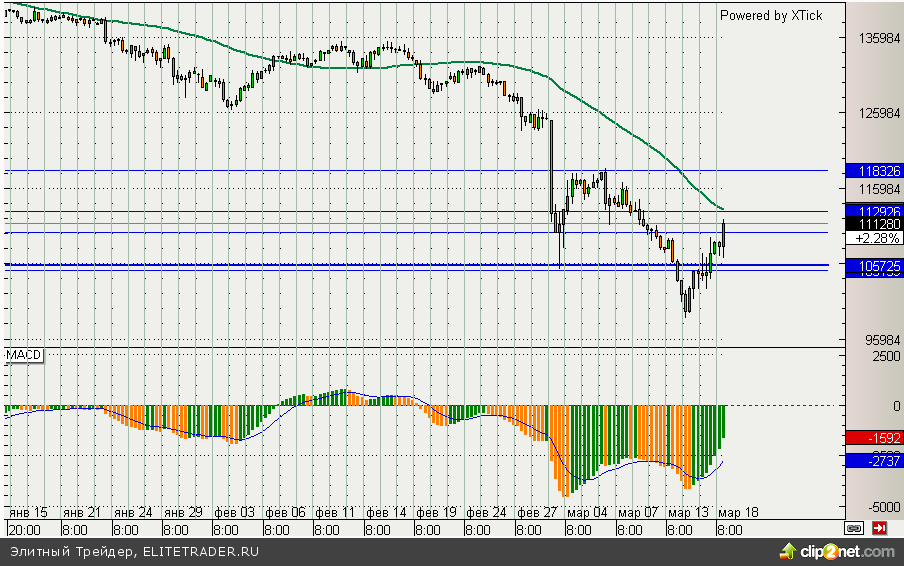 Фьючерс на индекс РТС сегодня ожидаемо демонстрирует неплохой рост прибавляя более 2%. Выступление Путина относительно ситуации на Украине несколько улучшило настроения участников во второй половине дня. При этом RIH4 уже вплотную подобрался к отметке 112000, где располагается серьезное сопротивление и может несколько скорректироваться в ближайшее время.