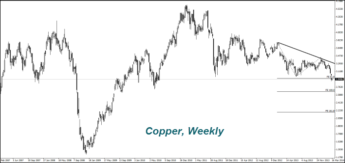 Цена на медь (Copper) стабилизировалась около минимума за последние 44 месяца. Спрос пока остаётся слабым, так как потребители не торопятся покупать в надежде на дальнейшее снижение котировок. Запасы меди на Шанхайской фьючерсной бирже достигли максимума с мая прошлого года и составили 213,3 тыс. тонн. Премия к цене на медь в Сингапуре и Малайзии по сравнению с её стоимостью в Лондоне сократилась до $100 и $75 за тонну, соответственно со $150 в начале года. Впрочем, не всё так плохо. На рынке появились слухи, что недавний обвал цен на медь был вызван опасениями, что крупнейший импортёр медного лома в Китае - Jiangxi Copper Corp может объявить корпоративный дефолт. Однако они пока не оправдались, так как компания не отменила ни одной сделки.