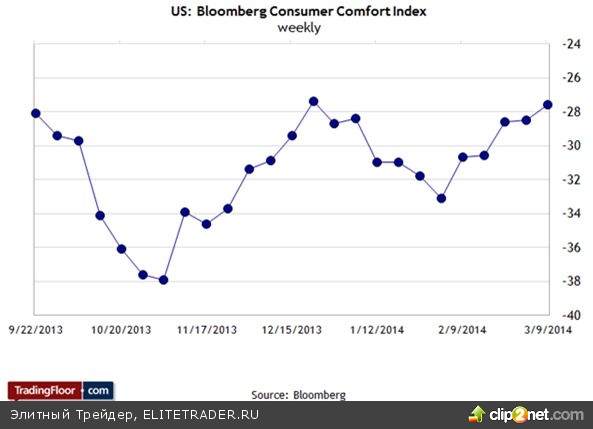 Индекс потребительского комфорта Bloomberg (13.45 GMT): В феврале розничные продажи возобновили рост, превзойдя по темпам прогнозы аналитиков. После месяца неутешительной экономической статистики такая новость воодушевила участников рынка. Пока неясно, послужила ли причиной ухудшения старая добрая зима или что-то другое, но благоприятный результат потребительского доверия позволяет надеяться на улучшение экономических показателей с приходом весны
