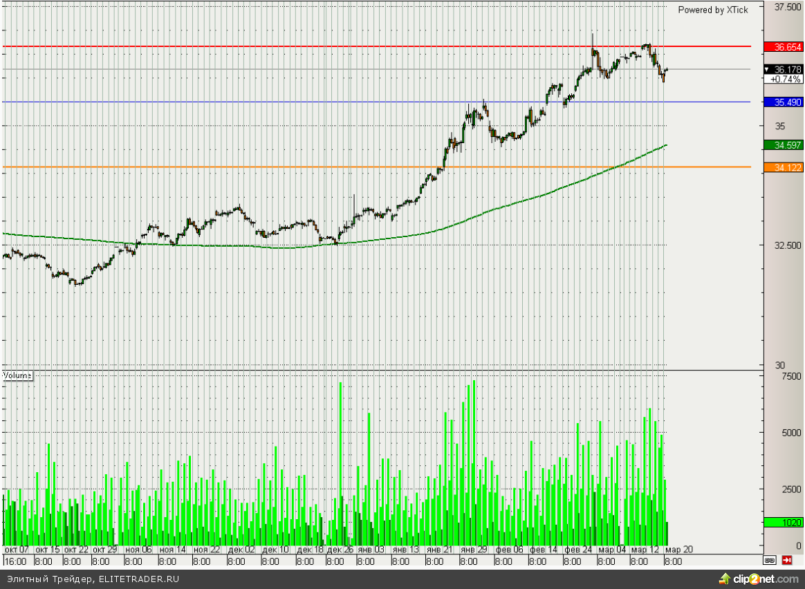 Российская валюта накануне благополучно добралась в район отметки 35,8 и в ближайшее время начнет формировать новый краткосрочный тренд. При этом небольшой потенциал роста рубля из-за перепроданности к аналогам из развивающихся стран еще сохраняется, но в целом фундаментальные факторы снова постепенно смещаются в сторону покупки американской валюты. В частности в среднесрочной перспективе очередную волну роста данной валютной пары могут спровоцировать такие факторы как: снижение нефтяных котировок в ожидании полной отмены санкций для Ирана, продолжающийся спад в российской экономике, а также сворачивание стимулирования и приближение момента поднятия ставок в США. Поэтому в диапазоне 35-35,3 можно будет снова постепенно покупать доллар по отношению к рублю.