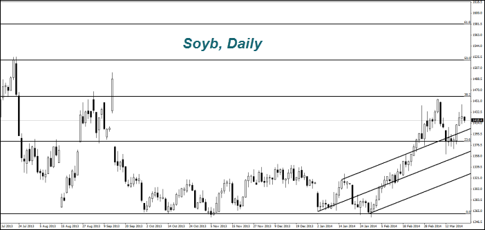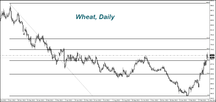 Стоимость пшеницы (Wheat) «отвалилась» от максимума за 11 месяцев. Инвесторы фиксируют прибыль после роста её котировок на 30% за полтора месяца. Поводом для закрытия «длинных» позиций стали прогнозы дождливой погоды в США в конце марта — начале апреля от американских метеорологических агентств. Ранее фермеры ожидали скудного урожая зимней пшеницы из-за засухи. Падению цен также способствует политическая стабилизация на Украине — седьмой в мире экспортёр пшеницы.