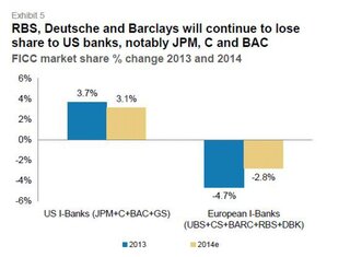 По мнению аналитиков Morgan Stanley и Oliver Wyman, банки США обладают преимуществом перед европейскими компаниями. По оценкам в 2013 г. американские банки отобрали у Deutsche Bank, Barclays, RBS, UBS и Credit Suisse примерно 5% от доли рынка фиксированного дохода, валюты и товаров (Fixed Income, Currency & Commodity, FICC). В 2014 г., по прогнозам экспертов, европейским банки уступят еще 3% своим конкурентам из США.