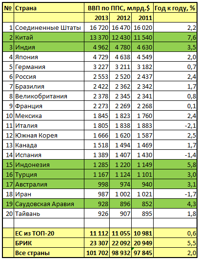 А.В.Суворов В списке крупнейших экономик по ВВП по паритету покупательной способности по данным ЦРУ в 2013 году есть небольшие изменения. Общемировой ВВП по ППС превысил 100 трлн.$. Вылетела из списка Польша, мой ближайший кандидат на цветную революцию, Мексика обошла Италию, Австралия обошла Иран, появилась в списке Саудовская Аравия.