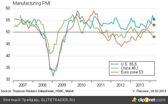 Сейчас к негативной динамике располагает и общемировой внешний фон. Сегодня были опубликованы данные по деловой активности в производственном секторе целого ряда ведущих мировых держав и все они без исключения оказались хуже ожиданий. Данные по деловой активности в производственном секторе Поднебесной упали в марте до отметки 48,1, аналогичный показатель еврозоны снизился до 53, с 53,2 месяцем ранее, а деловая активность в производственном секторе США упала в марте до 55,5 с 57,1.