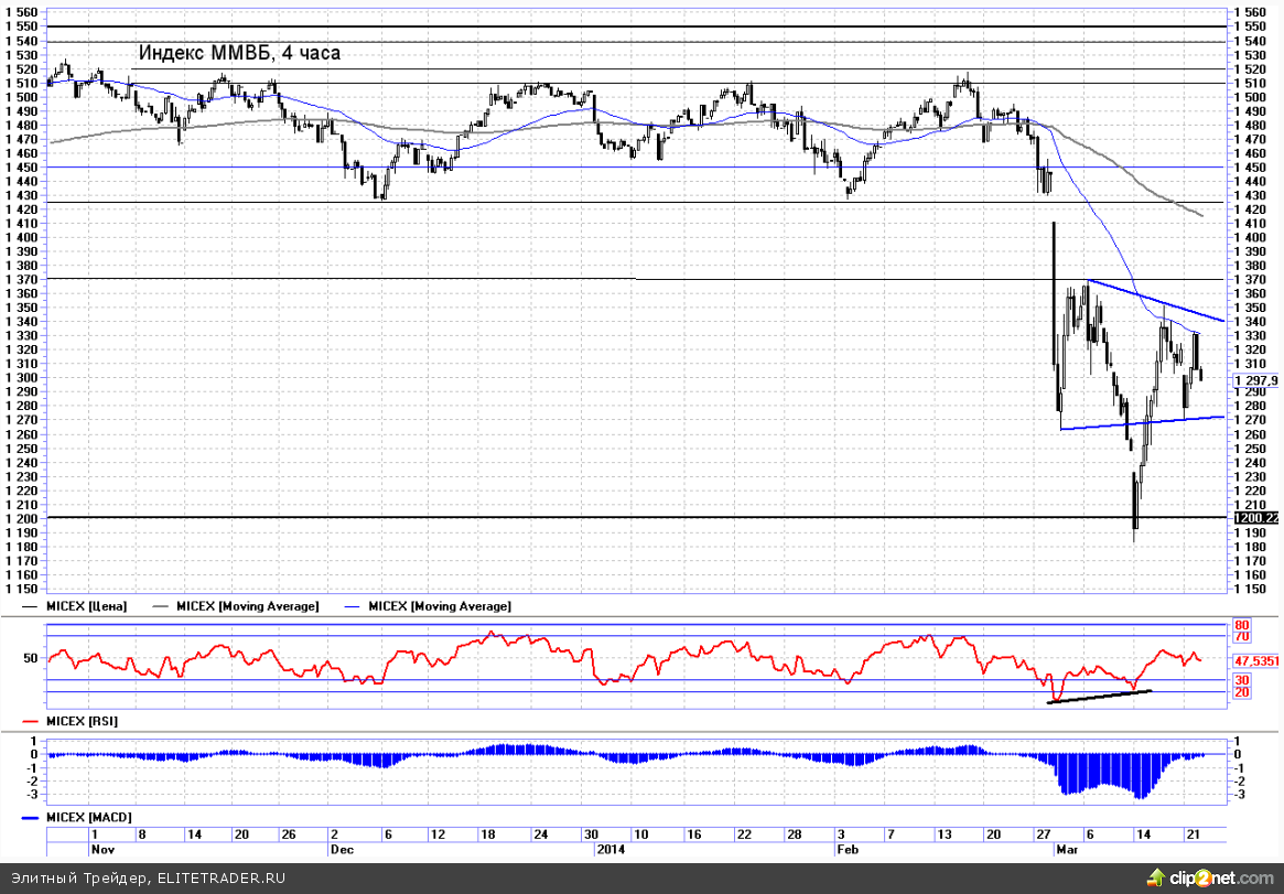 Главным образом негатив по отношению к российскому рынку по-прежнему связан в большей степени с политическими рисками. Распространяющиеся инсайд-сообщения о том, что Крым был лишь первым шагом и далее мы можем увидеть повторение прецедента в других восточных областях, никак не могут провоцировать инвесторов на покупки, тем более нерезидентов. При таком раскладе санкции со стороны Запада наверняка окажутся более болезненными. Не готов прогнозировать дальнейшее развитие событий вокруг украинского вопроса, а отмечу лишь, что инвестклимат с учетом политических рисков в лучшую сторону в ближайшей перспективе вряд ли поменяется. Кроме того общая экономическая ситуация в стране по-прежнему остается непривлекательной. По оценкам минэкономразвития, чистый отток капитала из России в первом квартале составит $65-70 миллиардов. Об этом вчера заявил заместитель главы министерства А. Клепач. В декабре МЭР прогнозировал $25 миллиардов по итогам всего 2014 года! Промах колоссальный. Клепач также отметил, что в России продолжается стагнация, но рецессии в экономике нет и не будет. Очень трудно мне с этим согласиться, ведь он сам утверждает, что ожидает близкий к нулю рост ВВП в первом квартале. Точек роста сейчас нет, так что поверить в то, что после первых трех месяцев ситуация начнет меняться в лучшую сторону, совсем не получается. Последние пару лет большинство прогнозов МЭР, ЦБ, Минфина по факту пересматриваются в худшую сторону. В начале 2013 нам обещали существенное улучшение ситуации во втором полугодии, но результат в итоге опять оказался заметно хуже прогнозов. В то же время Минэкономразвития уже сейчас рассчитывает на ускорение инфляции в России в марте до 0,9-1%, а в годовом выражении до 6,9-7%. Всего лишь полтора месяца назад еще был очень популярным цитируемый прогноз в 5% по итогам 2014 года, но вот уже с первых же дней наше недоверие к этим публичным официальным ожиданиям начало оправдывается. Можно пенять на слабеющий рубль, однако мы же все помним заявления руководства ЦБ РФ о том, что ослабление национальной валюты не окажет сильного влияния на рост цен. Результат на табло.