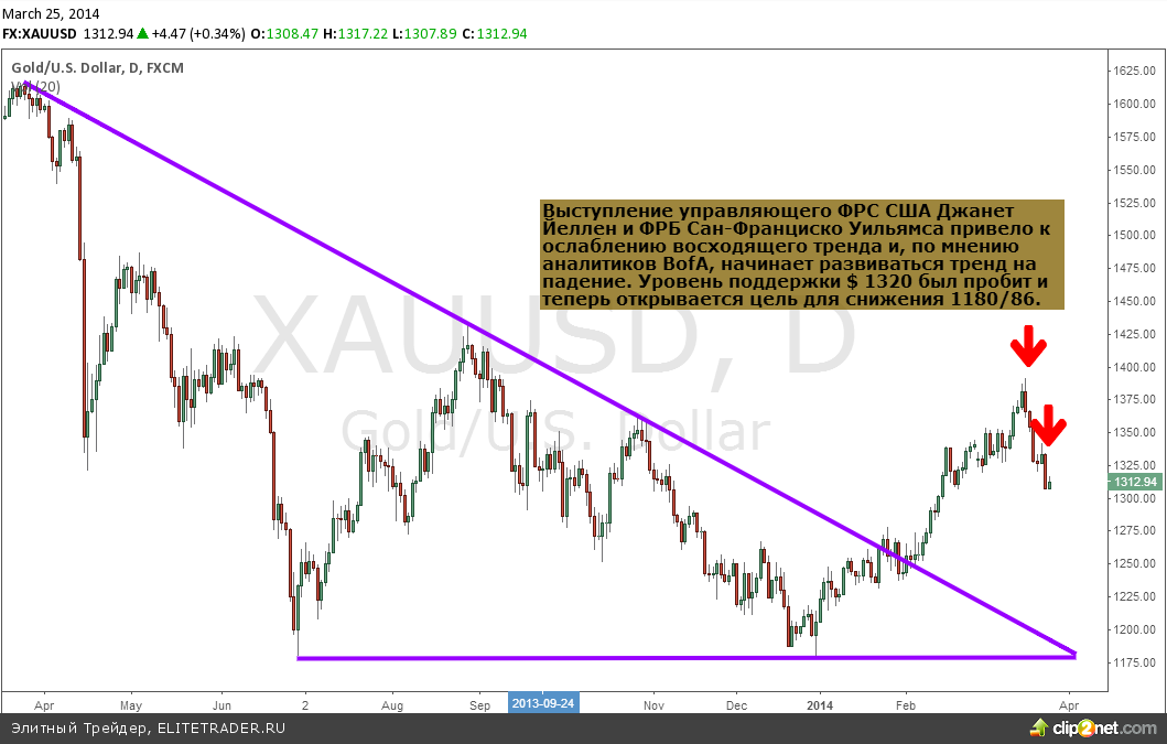 Они считают, что при преодоление уровня поддержки $ 1320, что уже произошло в ходе вчерашней торговой сессии на фоне выступления управляющего ФРС Сан-Франциско Уильямса, приведет к снижению до $ 1180/86 – декабрьского минимума 2013 года. Также экономисты порекомендовали открывать короткие позиции на локальных максимумах.