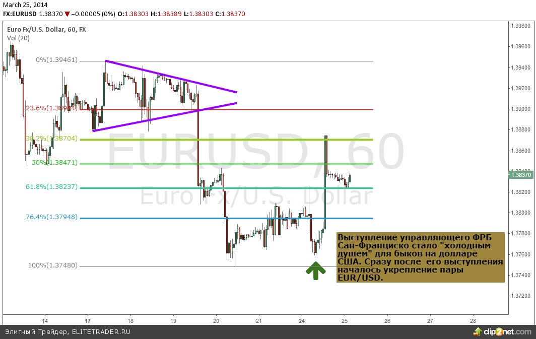 Но ближе к вечеру ход торгов кардинально изменился. Внешним фоном, который на него повлиял, стали заявления главы ФРБ Сан-Франциско Джона Уильямса и решения принятые на саммите G7 в Брюсселе. Г-н Уильямс, принимающий участие в заседаниях ФРС США, прокомментировал завершившееся на прошлой неделе заседание финансового регулятора. Некоторые участники торгов на финансовых рынках сделали предположение об ужесточении политики процентных ставок раньше чем ожидалось. Руководитель ФРБ Сан-Франциско опроверг появившиеся предположения и подтвердил комментарии Джанет Йеллен о повышении ставки не ранее чем через шесть месяцев после окончания программы по выкупу активов. Участники саммита G7 также не приняли единогласного решения об исключении Российской Федерации из рядов международной организации. Также не смогли участники организации определиться с санкциями, которые необходимо наложить, хотя приняли решение о переносе встречи, намеченной на 4 - 5 июня в Брюссель. Сразу после появления этих новостей евро получил поддержку и пара EUR/USD устремилась к уровню 1.3870 (38.2% коррекция по уровню Фибоначчи), преодолев за несколько часов 100 пунктов, но отступила от внутридневного максимума прошедшей торговой сессии и сейчас торги проходят чуть выше важного уровня поддержки 1.38.