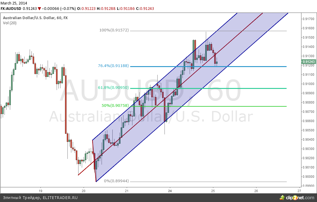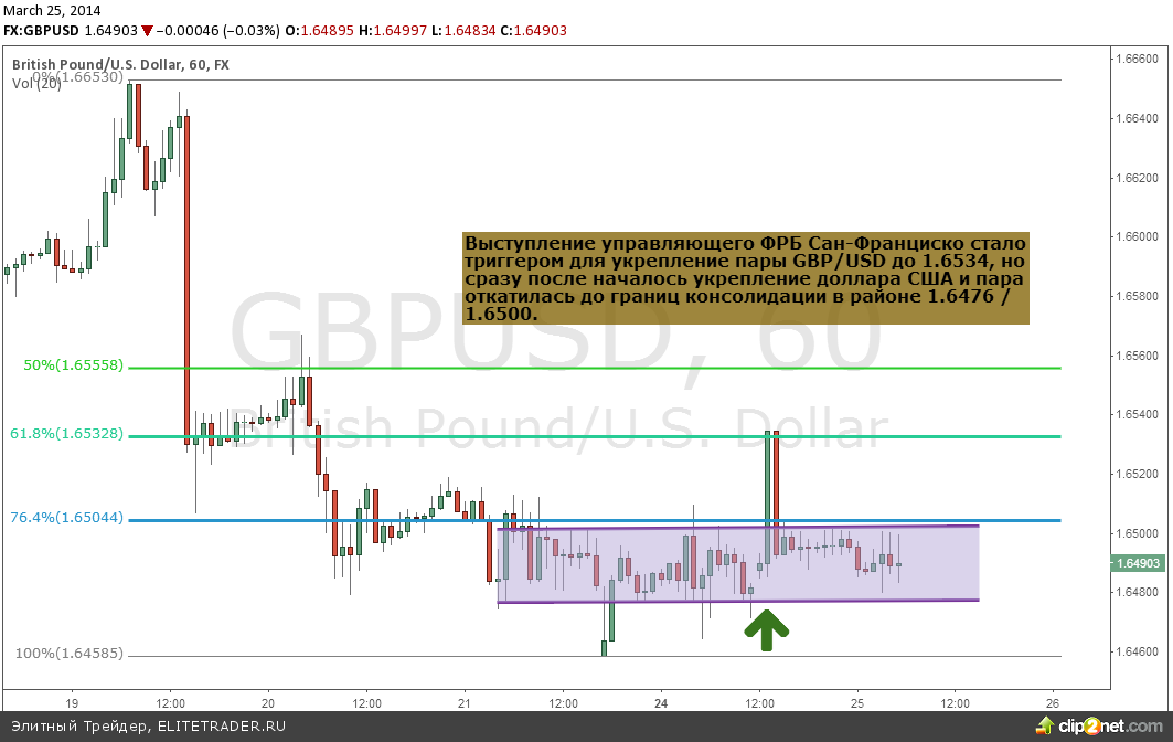 Но ближе к вечеру состоялась пресс-конференция президента ФРБ Сан-Франциско Джона Уильямса. В своем выступлении он дал комментарий о прошедшем 18 -19 марта заседании ФРС США. Некоторые из участников рынка сделали предположение о старте повышения процентных ставок в ближайшее время. Но он не склонен рассматривать комментарии председателя ФРС Джанет Йеллен как “жесткие”, после чего в течение прошедшей недели происходили укрепление доллара США. Комментарий г-на Уильямса о перспективах изменения процентной ставки только через полгода после полного сворачивания программы выкупа ценных бумаг QE 3. Его слова опровергли утверждения об ужесточении политики и привели к появлению бычьих настроений на рисковых активах. На валютной паре GBP/USD и других рисковых активах началось укрепление до максимума прошедшей сессии 1.6534 (61.8% коррекция по фибо уровням). Но сейчас торги развиваются в границах равноудаленного канала, и консолидация проходит между 1.6476 / 1.6500, зародившейся в середине прошлой недели.