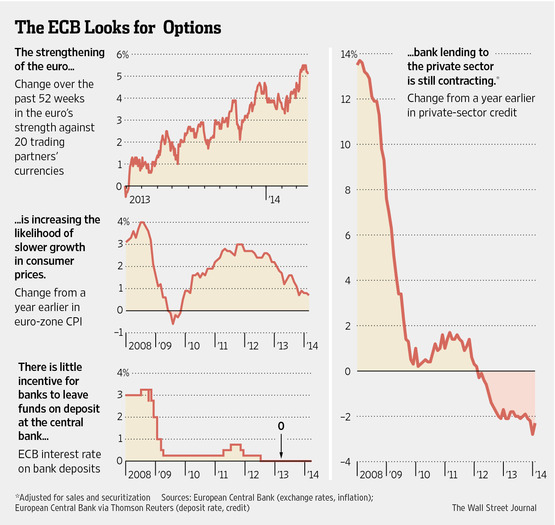 Чиновники ЕЦБ демонстрировали во вторник решимость рассматривать более существенные шаги в отношении защиты от опасно низкой инфляции, подтверждая, что банк готовдействовать. Возможные инструменты воздействия, о которых говорили различные политики еврозоны, включают в себя отрицательные процентные ставки, что фактически значит, что коммерческие банки могут платить ЕЦБ за размещение средств. Меры также включают в себя закупки долгов государственного и частного секторов для снижения долгосрочных ставок и придания импульса кредитованию.