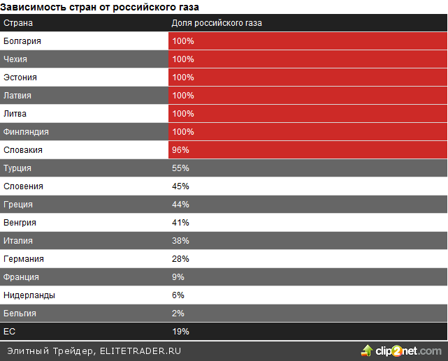 Некоторые страны, например Литва, Латвия, Эстония, Финляндия, Чехия, Словакия и Болгария, на 100% зависят от российского газа. Власти ЕС хотят снизить зависимость от России за счет повышения эффективности использования энергии, что сократит спрос на энергоносители, а также за счет перераспределения поставок и использования возобновляемых источников энергии. Но не стоит забывать, что прошедшая зима была самой теплой с 1981 г., поэтому европейские потребители чувствуют себя относительно свободно, а значительно повысить энергоэффективность можно только в долгосрочном периоде.