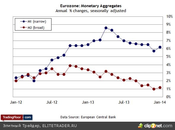 Появились и первые признаки того, что ЕЦБ не намерен ограничиваться лишь словами, а готов перейти к действиям. В предыдущем отчете денежные агрегаты М1 и М3 зафиксировали рост годовых показателей - впервые почти за год. Повторит ли февральский отчет эту позитивную динамику?