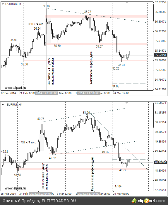 За первые три дня недели рубль укрепился к доллару на 1,93% и против евро на 2%. Дальнейшее укрепление рубля с технической точки зрения выглядит маловероятным. Курсы евро и доллара приблизились к своим промежуточным уровням поддержки. Мощным драйвером к укреплению рубля может выступить уплата налога на прибыль в пятницу. А сегодня вероятнее коррекционное движение в пределах 20 пунктов. Пока на Украине не состоятся президентские выборы, рубль останется под давлением.