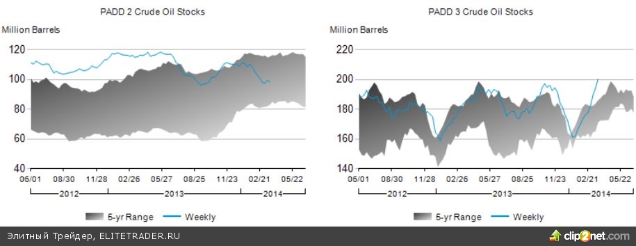 Динамика запасов сырой нефти в районах PADD2 и PADD3 (синия линия). Кликнуть для увеличения