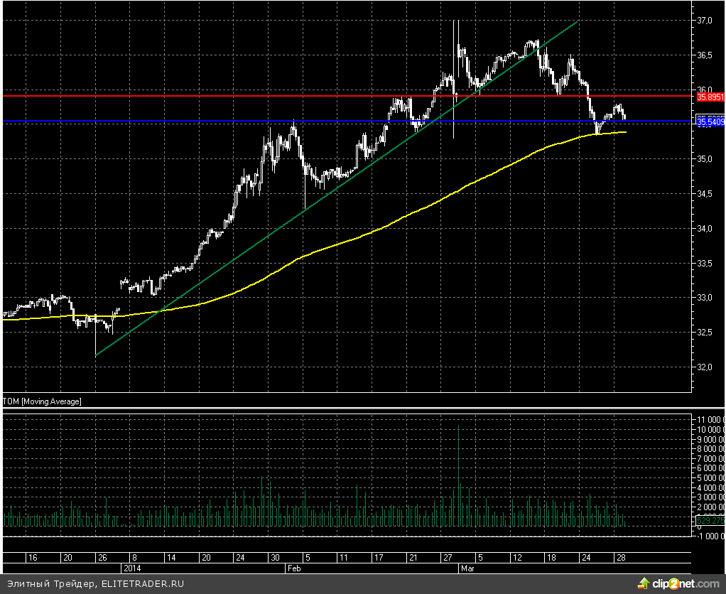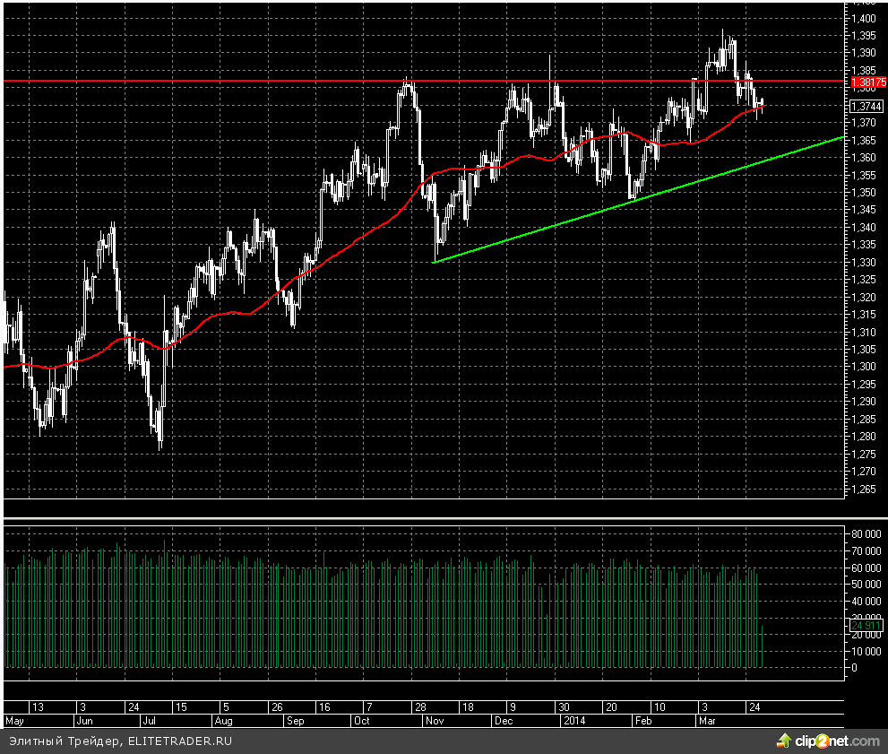 Евро растет сегодня к доллару на 0,03%. Европейская валюта сейчас торгуется в непосредственной близости к отметке 1,374, где сейчас проходит 50 дневная скользящая средняя. От данного уровня, скорее всего, мы увидим некоторый отскок вверх, но затем снижение может продолжиться. Драйвером для среднесрочного нисходящего тренда в паре евро/доллар может стать дополнительное стимулирование экономики еврозоны из-за растущих рисков дефляции. В частности индекс потребительских цен вопреки ожиданиям в марте вырос всего на 0,5% в годовом выражении, что является минимальным значением более чем за 4 последних года.
